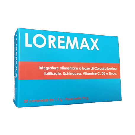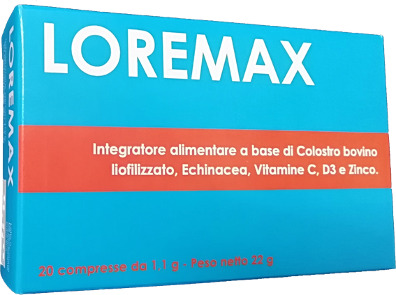 | LOREMAX 20 COMPRESSE COLOSTRO, LATTOFERRINA, ECHINACEA, VITAMINE D3 & C E ZINCO | IMMUNOMODULATORE E REGOLATORE DEL SISTEMA IMMUNITARIO | 1 cpr al mattino 1 cpr alla sera | € 24.90 | vedi scheda |