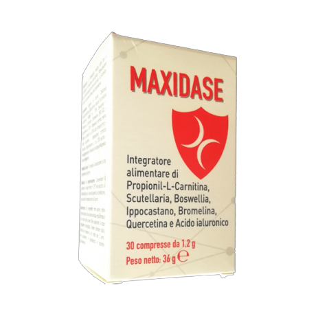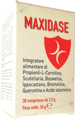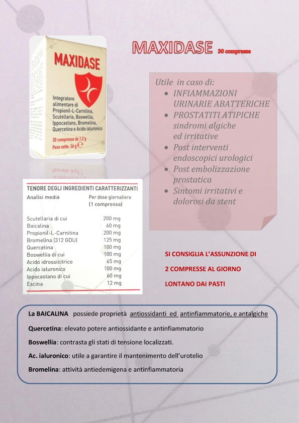 MAXIDASE 30 compresse BAICALINA - Quercetina - Boswellia - Ac. ialuronico Bromelina - Escina - L-Carnitina | • INFIAMMAZIONI URINARIE ABATTERICHE • PROSTATITI ATIPICHE sindromi algiche ed irritative • Post interventi endoscopici urologici • Post embolizzazione prostatica • Sintomi irritativi e dolorosi da stent | 2 compresse al giorno lontano dai pasti | € 26.90 |
